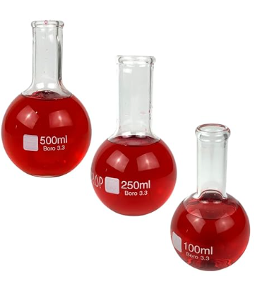 Este balão tem, como o nome diz, fundo esférico. Esse formato é projetado para distribuir calor de maneira uniforme quando colocado em uma manta aquecedora. É a peça principal em montagens de refluxo (aquecimento com condensador) e destilação. Sua boca é esmerilhada, permitindo o encaixe perfeito de outras peças, como condensadores ou outros balões, criando sistemas fechados.
