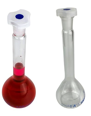 Este é o instrumento para preparar soluções com concentração definida com a máxima precisão. Tem um corpo redondo ou achatado e um pescoço longo e fino com uma única marca de aferição. Você dissolve o soluto em um pouco de solvente num béquer, transfere para o balão, lava o béquer e completa o volume com solvente até o menisco tocar exatamente a marca. A temperatura da solução deve estar na indicada no balão (geralmente 20°C).