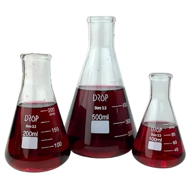 Você vai reconhecer pelo formato cônico e gargalo estreito. O Erlenmeyer é o rei das agitações e cultivos. Seu formato é perfeito para agitar uma solução sem que ela espirre para fora – ideal para dissolver completamente um pó. Em microbiologia, é muito usado para preparar meios de cultura líquidos antes da esterilização. O gargalo facilita tampar com algodão ou rolha. Também pode ser aquecido, mas com cuidado.