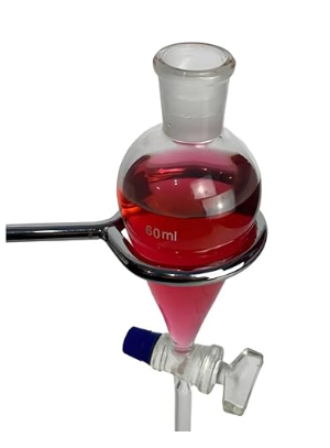 Este tem formato de pêra e uma torneira na parte inferior. Sua função exclusiva é separar líquidos que não se misturam (imiscíveis), como óleo e água, ou em extrações líquido-líquido. Você agita a mistura dentro dele, deixa em repouso até as fases se separarem completamente e então abre a torneira para drenar a fase mais densa (a de baixo), fechando-a antes que a fase superior chegue à saída.
