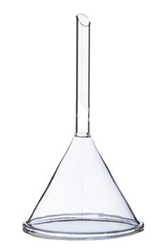 O mais básico dos funis. Use-o para duas coisas principais: 1) Transferir líquidos ou sólidos para recipientes de boca estreita (como um balão volumétrico) sem derramar. 2) Conduzir uma filtração por gravidade, apoiando um papel de filtro dobrado dentro dele. É simples, mas indispensável. Existem vários tamanhos; escolha um com diâmetro um pouco maior que o do papel de filtro.