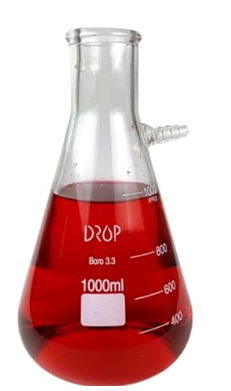 Como explicado, é o frasco grosso que dá suporte ao Funil de Büchner. Sua saída lateral é conectada a uma trompa de vácuo ou bomba, criando a pressão negativa que acelera a filtração. É robusto para aguentar a diferença de pressão. Nunca use um frasco comum no lugar do kitassato, pois ele pode implodir com o vácuo.