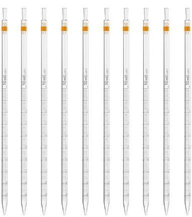 É a irmã mais flexível da volumétrica. A pipeta graduada é um tubo longo com marcas ao longo do corpo, permitindo que você aspire e transfira volumes variáveis (ex: 3,2 mL, 5,7 mL). Use sempre uma pera de sucção ou micropipetador automático. Para uma medição precisa, lembre-se de ler o menisco (a curvatura do líquido) na altura dos olhos. É perfeita para adicionar volumes exatos de reagentes em procedimentos.
